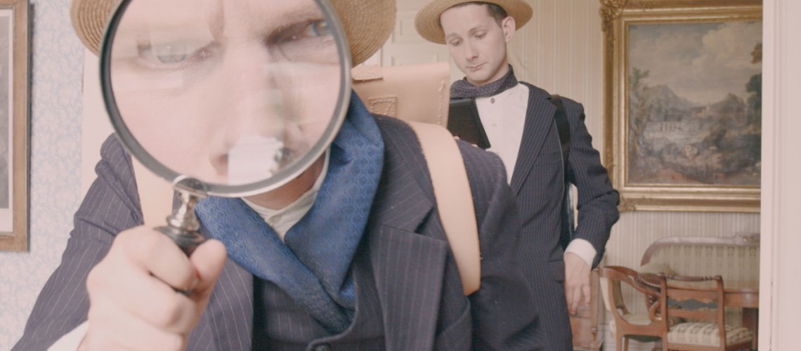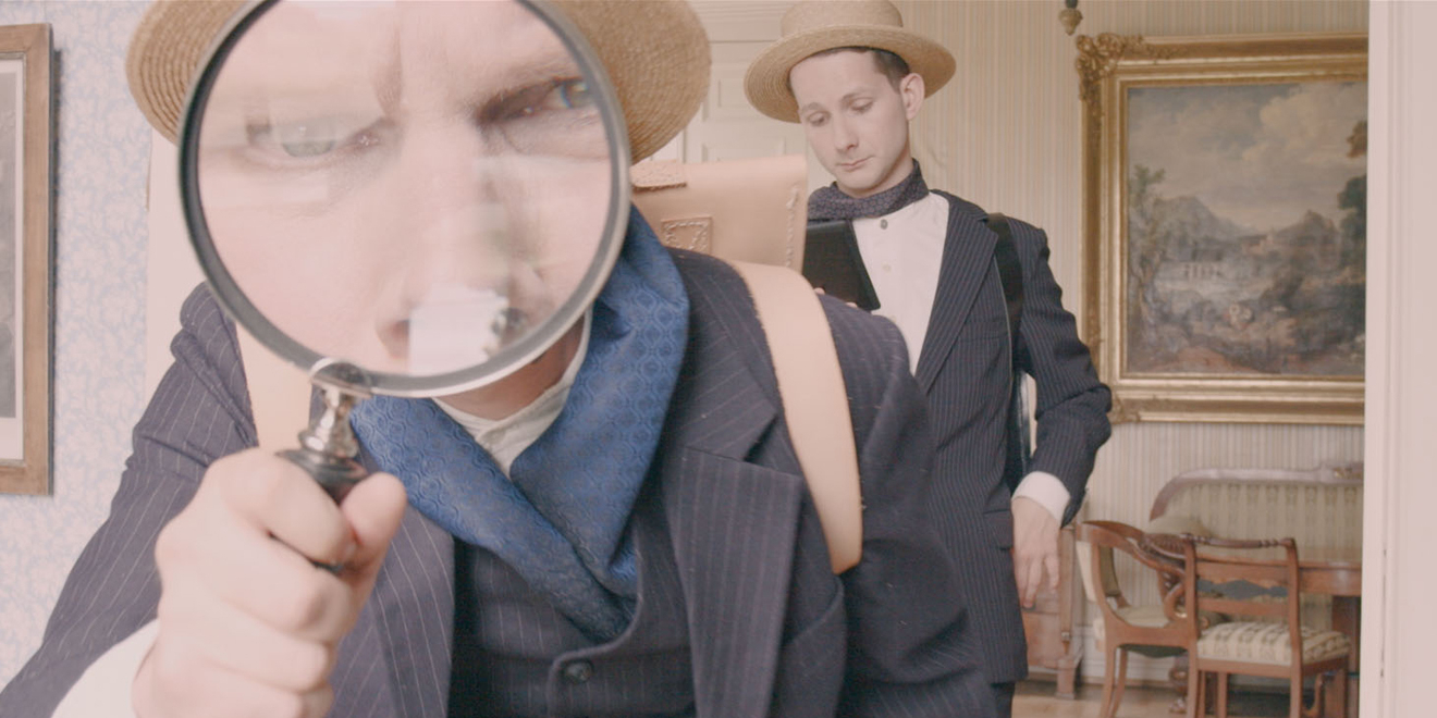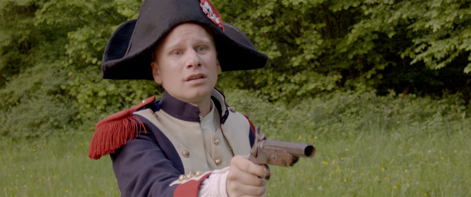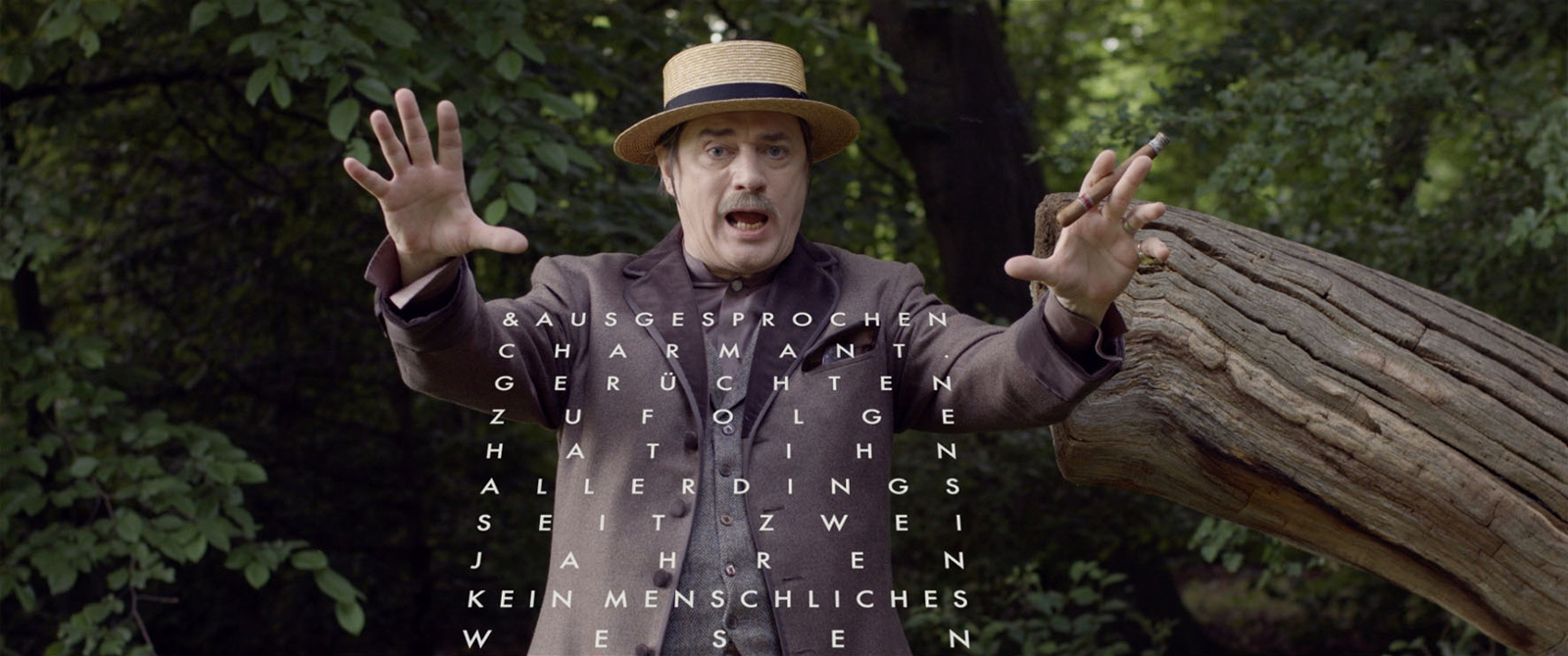 Zimmer hat seine Satire wie ein Theaterstück inszeniert. Es gibt keine Musik, keine Statisten, keinen natürlichen Lauf der Dinge. Blixa Bargeld erzählt uns (auffällig schlecht ablesend) die wichtigsten Eckdaten: man wäre im Jahr 2020, die beiden übellaunigen Protagonisten seien Aristokraten. Ah ja, nun versteht man auch die Mixtur zwischen barocker Kleidungsweise und Hipster-Rucksack, das Siezen und gleichzeitige Umsichwerfen mit Schimpfworten wie “Fotze”, das Lesen von Büchern und das Benutzen von Kindle-Readern. Der Trend ist deutlich: wir lieben die Verschmelzung von technischem Know-How und Vintage-Elementen. So etwas konnte man bereits in dem gefühlvollen Spike Jonze Film “Her” (2013) sehen.