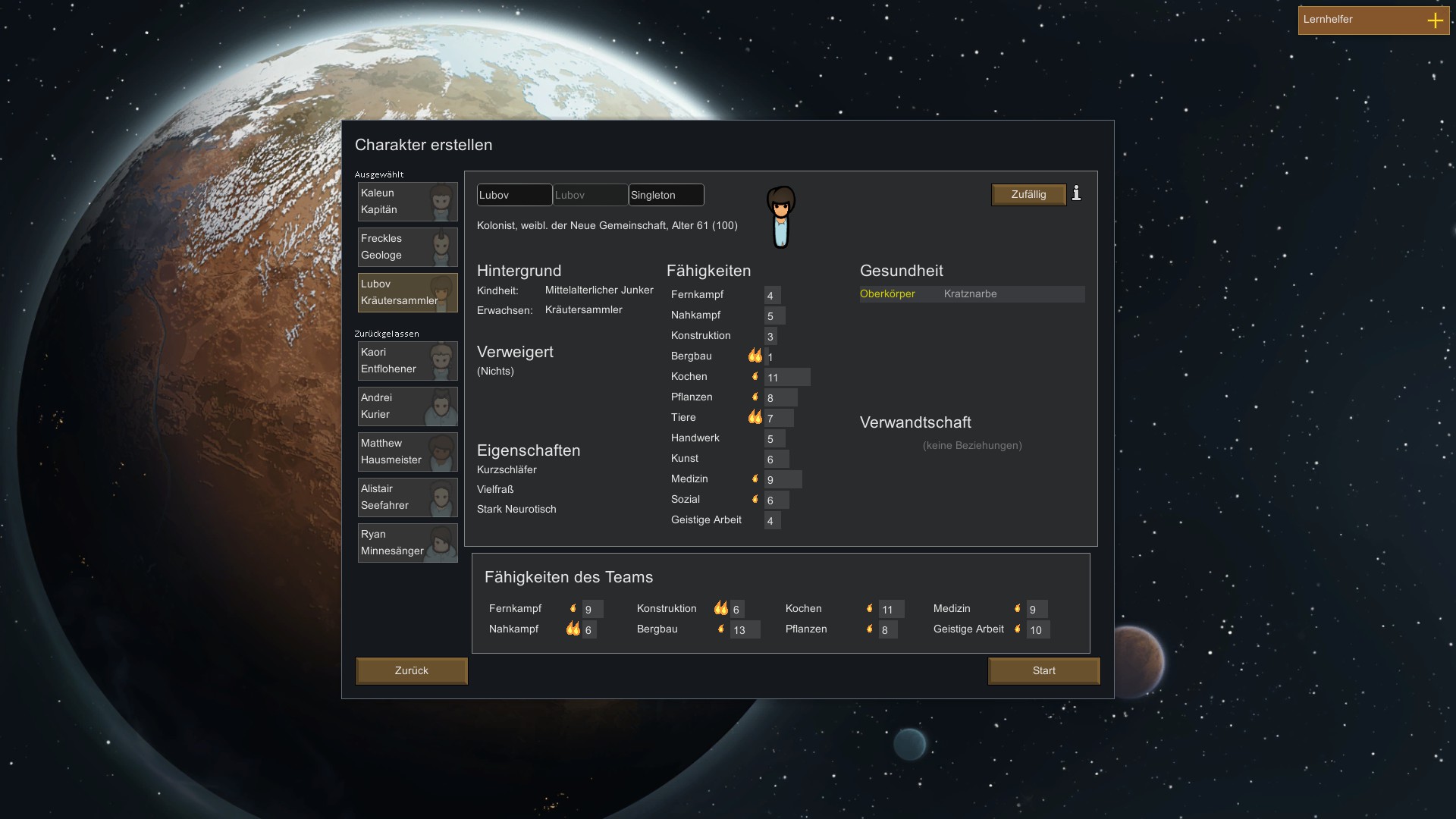Für den ersten Kolonisten achte ich auf überwiegend positive Eigenschaften. Lubov ist zum Beispiel eine Kurzschläferin und regeneriert damit schneller ihre Energie. Außerdem ist sie ein Vielfraß. Sie wird zwar mehr essen als andere, ist dafür aber auch eine umso bessere Köchin. Ihre stark neurotische Art könnte später aber einigen Ärger verursachen.