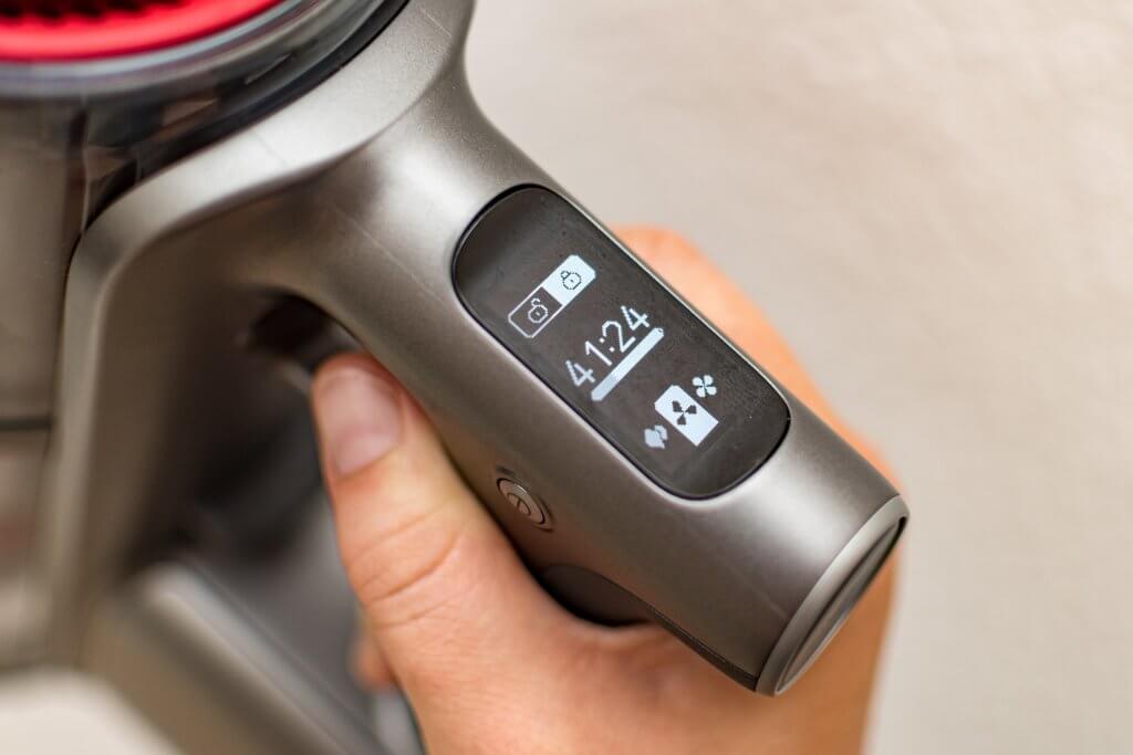 Mit Abmaßen von 28 x 11 x 23 Zentimetern und einem Gewicht von 1,5 Kilogramm ist er kompakt und durchaus handlich. Im unteren Bereich befindet sich ein großer 500 Milliliter fassender Staubtank, dessen Inhalt durch ein mehrstufiges, auswaschbares Filtersystem vor Kontakt mit dem starken Motor bewahrt wird. Allergiker freuen sich über einen optional montierbaren Staubbeutel. Ein kleines 1,3 Zoll großes OLED-Display liefert Informationen zu Akkulaufzeit sowie Saugmodus. Der lässt sich über einen per Daumen erreichbaren Gummitaster einstellen. Ein etwas wackeliger Pistolen-Trigger startet den Saugmotor, ein kleiner Sperr-Knopf auf der linken Seite stellt ihn auf permanent.