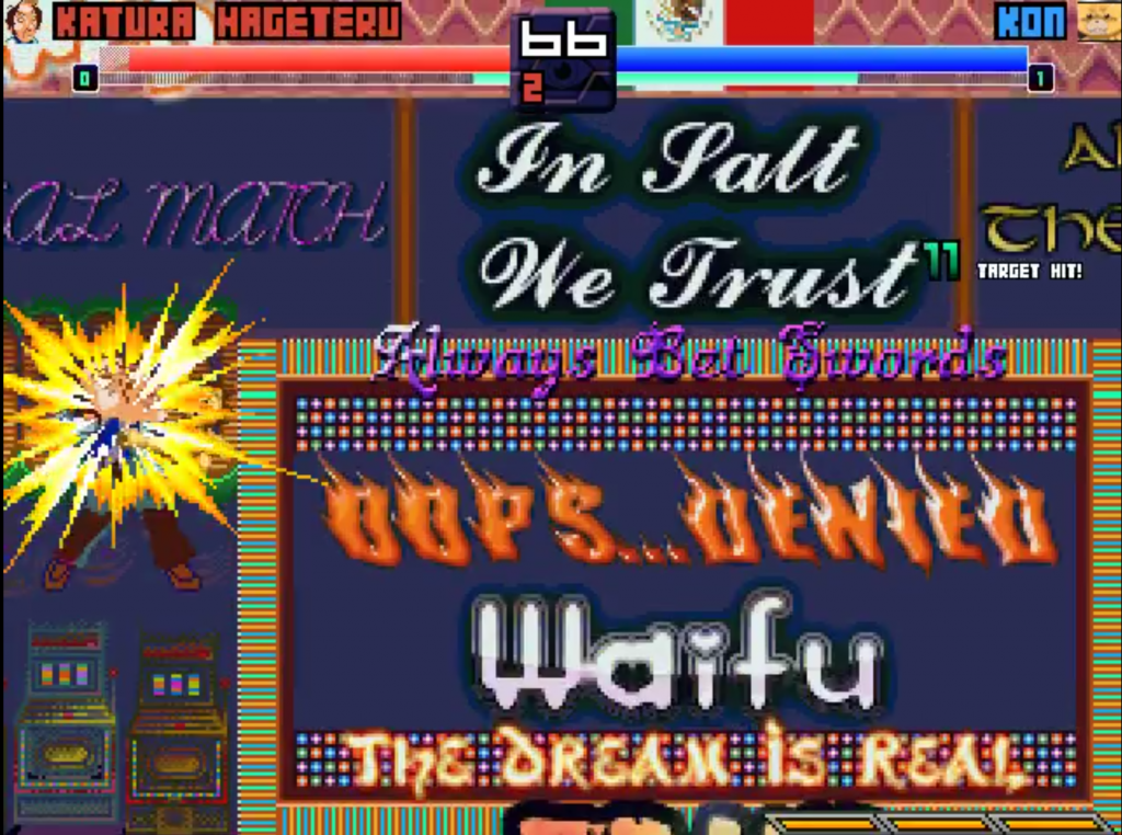 Und hier wird Salty Bet interessant. Denn all die Charaktere, die sich in dem Spiel befinden, wurden von der Community selbst erschaffen. Viele sind klassische Anime-Charaktere aus der Street Fighter-Szene oder aus bekannten Anime-Serien, aber immer wieder gibt es auch absolut absurde, verrückte Charaktere, die man nicht mal einem Genre oder überhaupt einer Spezies zuordnen könnte, wenn man es wollte. So treten Schwertkämpfer gegen Züge an und kleine Prinzessinnen gegen eine Figur, die aussieht, als wäre Frankenstein in eine alte Arcade-Maschine gelaufen und stecken geblieben. Der Kreativität sind hier buchstäblich keine Grenzen gesetzt.