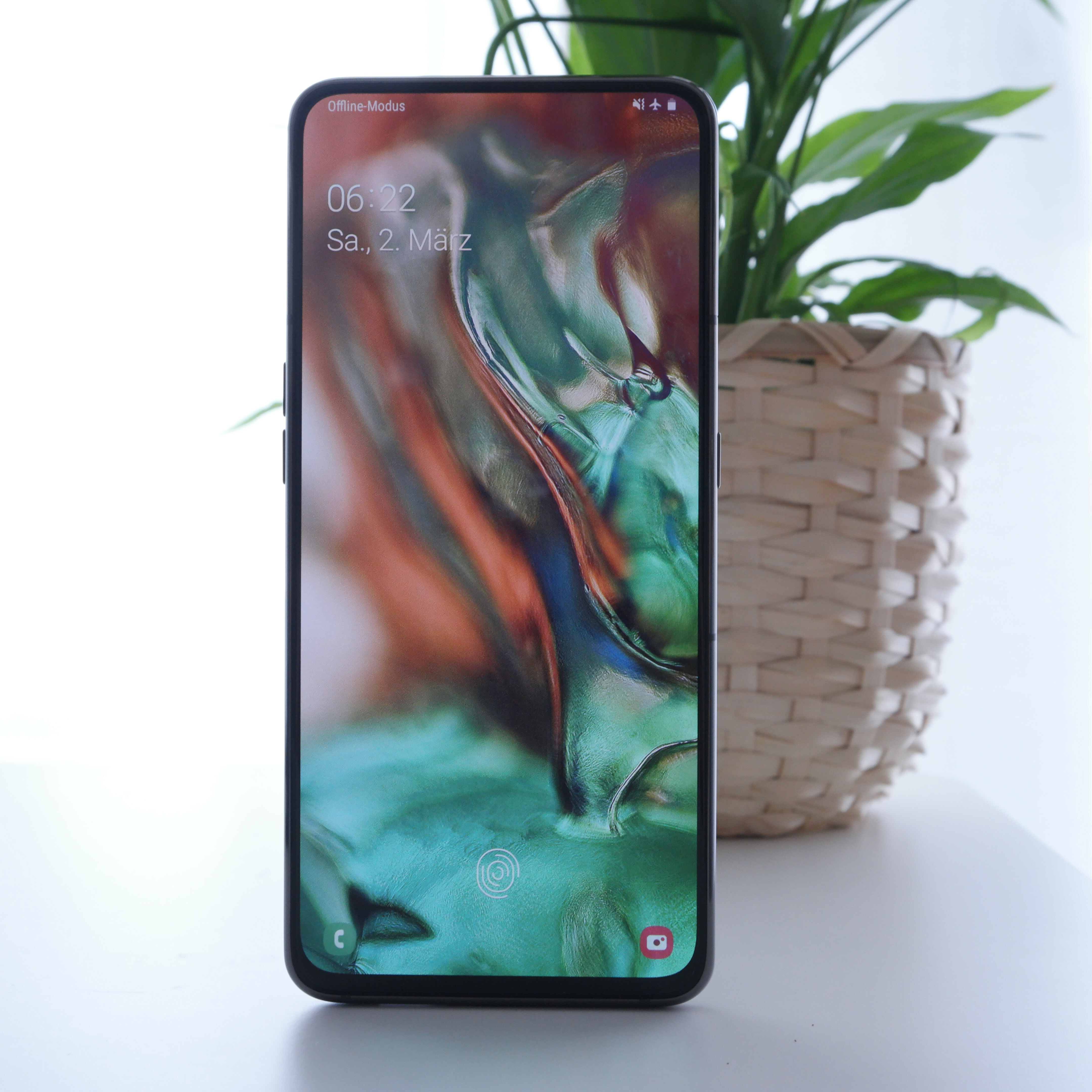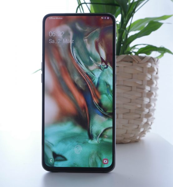 Mit dem Galaxy A80 bringt Samsung einen mechanischen Eye-Catcher in die Mittelklasse. Der südkoreanische Hersteller verbaut hier erstmals eine gleichzeitig ausfahrbare und rotierende Kamera, die sowohl hinten, als auch vorne Bilder knipst. Das Resultat? Ein Notch-freies Display. Dadurch füllt das 6,7 Zoll große Super-AMOLED-Panel beinahe die komplette Front des Smartphones und weist nur sehr dünne Display-Ränder auf. So können sich eure Augen auf die Inhalte konzentrieren, die das Display wiedergibt. Und hier gibt es fast nichts zu beanstanden. Die Full-HD+ Auflösung zeigt gestochen scharfe Inhalte und Details. Weiterhin wirken auch die Farben realistisch und satt. Die maximale Helligkeit ist für den Innenbereich absolut ausreichend, obwohl wir im Freien schon eher Probleme hatten, die Inhalte auf dem Display gut abzulesen.