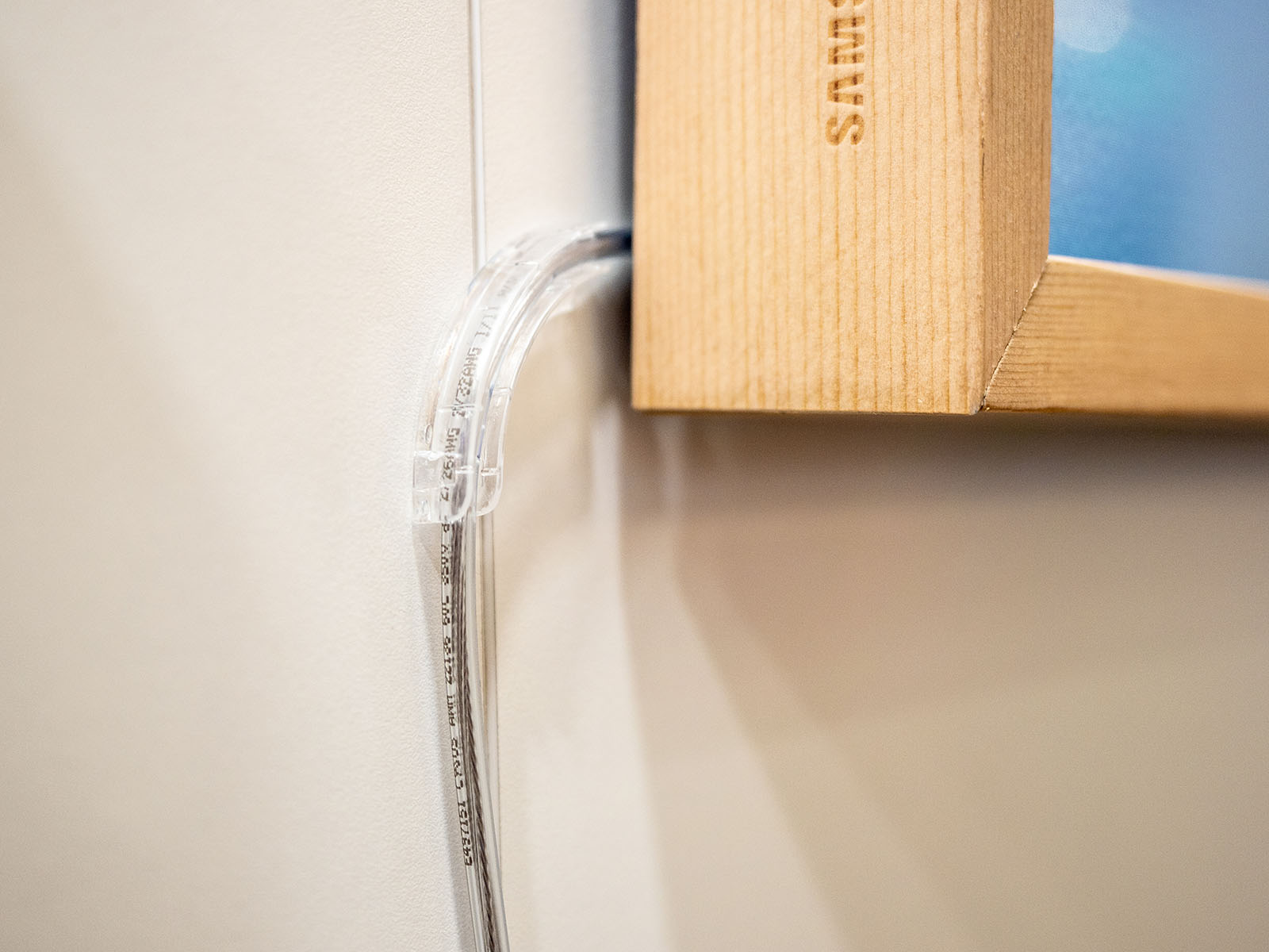 Während im vergangenen Jahr ein dickes Netzkabel das Modell als Technik-Gerät outete, hat Samsung dies in 2018 gekappt. Stattdessen versorgt The Frame nur noch ein drei Millimeter dünnes Glasfaserkabel mit Bild, Ton und Strom. Wegen der halbtransparenten Isolierung lässt sich die Verbindung recht unauffällig verlegen. Geschickt platziert, ist der Fernseher daher noch weniger als solcher zu erkennen.