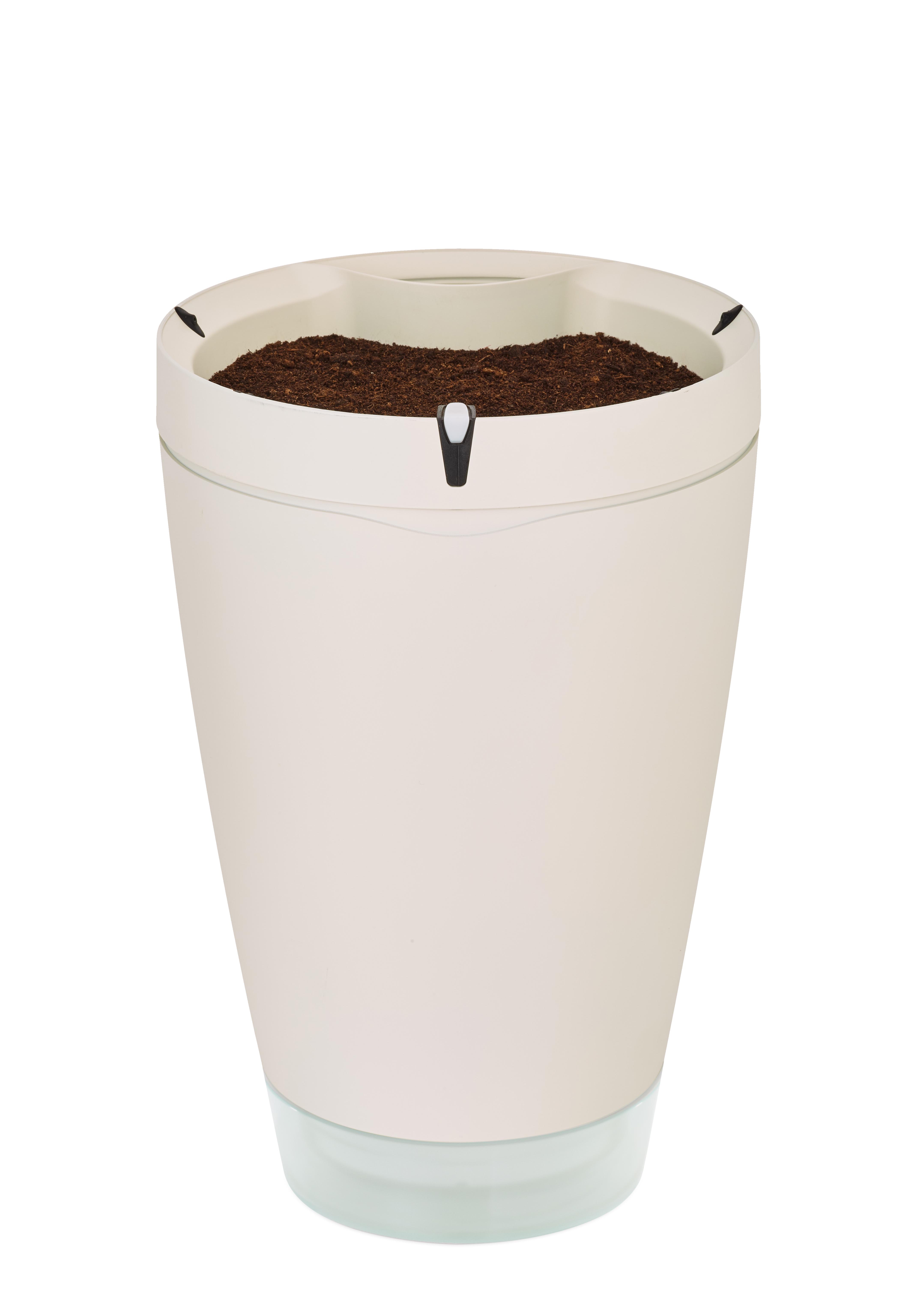 Mit 31 Zentimetern Höhe und 20,5 Zentimetern Durchmesser verfügt der Parrot Pot über eine stattliche Größe. Viel Pflanze passt aber nicht in den Topf. Gut die Hälfte des Gehäusevolumens ist für Wassertank und Wasserzuführung, Sensorik sowie vier AA-Batterien reserviert. Der Wurzelballen sollte daher laut Hersteller-App nicht üppiger als 16 Zentimeter im Durchmesser ausfallen. In meinem Testexemplar fand ein junger Drachenbaum ausreichend Platz. Das Gehäuse ist nach IPX5 wasserfest und erlaubt daher sowohl einen Innen- als auch einen Außeneinsatz. Die Kunststoffoberfläche verleiht dem Parrot Pot eine sterile Ästhetik, die an Wohnlichkeit zu wünschen übriglässt. Der halbtransparente Überflussbehälter im Topfboden meines weißen Parrot Pot stört ebenfalls die Optik, weil bräunlich verfärbtes Pflanzenwasser deutlich durchscheint. Beim roten und schwarzen Modell ist diese Komponente blickdicht. Im Zweifelsfall spielen bei diesem Blumentopf ohnehin eher die inneren Werte eine entscheidende Rolle für den Kauf.