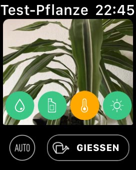 So soll die App vor zu geringer Bodenfeuchte warnen. Aber nur, wenn der Pflanzentopf sich im manuellen Modus befindet, bei dem der Nutzer die Bewässerungsdüsen händisch in der App auslöst. Hingegen für den automatischen Betrieb, in dem sich mein Testexemplar durchgehend befand, ist in diesem Fall keine Warnung vorgesehen. Dennoch wäre dies angebracht gewesen. Denn nur durch Zufall entdeckte ich, dass die Bodenfeuchte unter einen kritischen Wert gefallen war. Wie ich herausfand, stellte die Bewässerung ihren Dienst ein, weil die Messung der Bodenfeuchtigkeit nicht korrekt funktionierte. Vermutlich, weil das Erdreich zu locker war. Aber auch darauf hätte mich die App eben gern hinweisen können. Die App für die Apple Watch betrachte ich in dieser Form als überflüssig. Neben einer sehr groben Übersicht zum Zustand der Pflanze, bietet sie zwei Touch-Buttons für den Betriebsmodus und das manuelle Gießen. Jedoch lassen sich diese nur aktivieren, wenn die iPhone-App parallel aktiv ist. Dann kann ich diese Funktionen aber genauso gut auf dem Smartphone-Display ausführen. Läuft die iPhone-App lediglich im Hintergrund, sind alle Schaltflächen auf der Apple Watch ausgegraut und somit funktionslos.