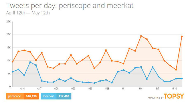 Sind die Zahlen von App Annie vielleicht gar nicht aussagekräftig? Wie sieht die Aktivität denn direkt bei Twitter aus? Sieht man sich die Mentions bei der Social Media Suchmaschine Topsy an, ist am 2. Mai eine auffällig hohe Aktivität zu verzeichnen – diese ist dem Pacquiao vs. Mayweather-Boxkampf geschuldet. Nun sind die beiden Apps mit Sicherheit nicht gerade die beste Plattform, um einen Boxkampf zu verfolgen. Da viele Nutzer technische Probleme mit den legalen Pay-per-View-Angeboten hatten, wurden Periscope und Meerkat aber dankbar angenommene Alternativen. Abgesehen von diesem Ausschlag sind die Zahlen aber sehr übersichtlich. Twitter und Periscope vertreten zwar die Meinung, dass die Anzahl der Tweets, die die Apps nennen, nichts darüber aussagen, wie viele Nutzer über die Apps livestreamen, da die Ankündigungs-Tweets, dass man die App nutzt, ausgeschaltet werden können, allerdings ist das irrelevant, denn der generelle Rückgang der Mentions spiegelt durchaus das generelle Interesse an den Apps wieder.