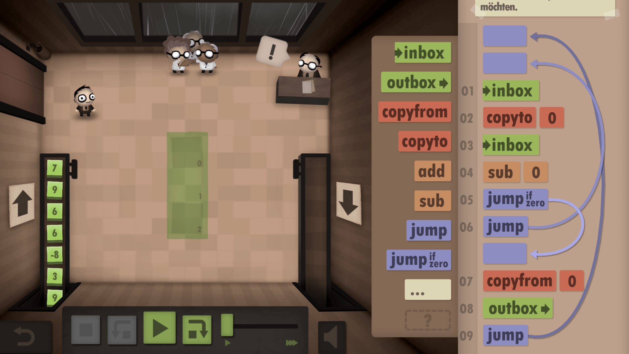 Der Befehl „jump“ wiederum sorgt dafür, dass das Programm an eine andere Stelle springt. So könnt ihr im Ablauf weiter nach vorne oder aber wieder an den Beginn des Programms springen. So erzeugt ihr „Schleifen“. Schleifen wiederum sind Konstrukte, die in so ziemlich jeder Programmiersprache einen elementaren Bestandteil darstellen. Hinzu gesellen sich auch an Bedingungen geknüpfte Sprünge. „Jump if zero“ beispielsweise lässt das Programm nur dann Springen, wenn der Wert des Pakets in eurer Hand gleich „0“ ist.
