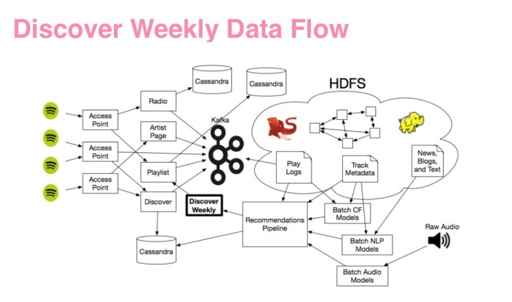 Und wie übersetzt sich dieses Konzept in Spotify? Die Ergebnisse des Algorithmus lassen sich vor allem in der Discovery Weekly Playlist sehen. User bekommen hier jeden Montag 30 Songs präsentiert, die zu ihrem Geschmack passen. Und dabei ist der Algorithmus erstaunlich erfolgreich. Im Moment arbeitet der Spotify Algorithmus, der bis heute den Namen Echo Nest trägt, aufgrund von drei Hauptkomponenten.