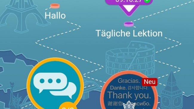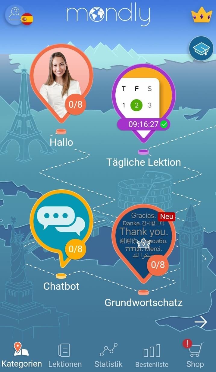 Was diese Sprachlern-App neben den gut aufgearbeiteten Lerninhalten zusätzlich ausmacht, ist die schöne grafische Gestaltung. Die einzelnen thematischen Kategorien sind wie Pins auf einer Karte dargestellt. Ihr könnt euch somit einmal um die Welt lernen. Wem diese Darstellung jedoch zu verspielt ist, kann sich die Kategorien mit den jeweiligen Lektionen auch in Listenform anzeigen lassen.