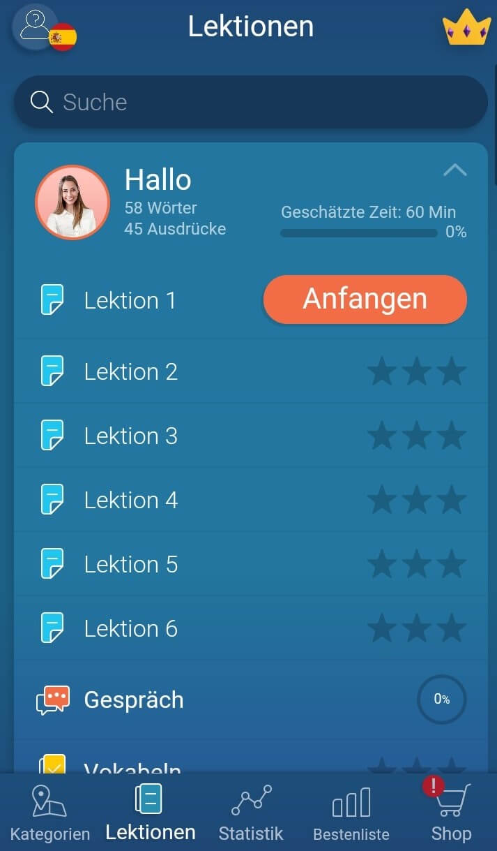 Organisiert sind die Lerneinheiten in Kategorien. Zu jeder Kategorie gibt es sechs Lektionen, in denen neue Begriffe und Ausdrucksweisen gelernt werden. Außerdem ist in jeder Kategorie eine Gesprächslektion und ein Vokabeltrainer enthalten. Im Gespräch könnt ihr die Aussprache üben, indem ihr die Sätze nachsprecht und aufnehmt. Ihr könnt euch die Aufnahme im Anschluss anhören und so eventuelle Aussprachefehler korrigieren.