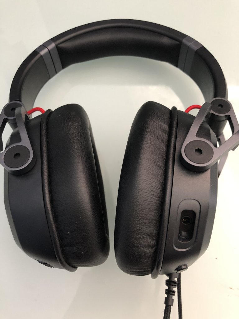 An der unteren Seite der rechten Ohrmuschel befindet sich ein Regler zum Einstellen der Lautstärke und knapp darüber die Multifunktionstaste, welche man in der dazugehörigen Software mit einer Funktion belegen kann. Links unten kann das einsteckbare Mikrofon ein- und ausgestellt werden. Die beiden Kabel, eines für die USB-Verbindung für den PC und das andere für das Mikrofon, werden ebenfalls an der linken Ohrmuschel eingesteckt. Das Mikrofon findet vorne seinen Platz und stört, trotz relativ großem Kopf, bei der Verwendung nicht. Allgemein ist der Tragekomfort bei dem Gerät sehr hoch und auch nach mehreren Stunden kann man den Kopfhörer noch angenehm tragen.