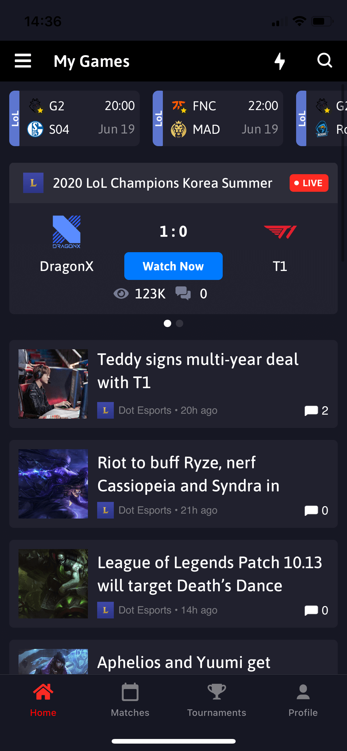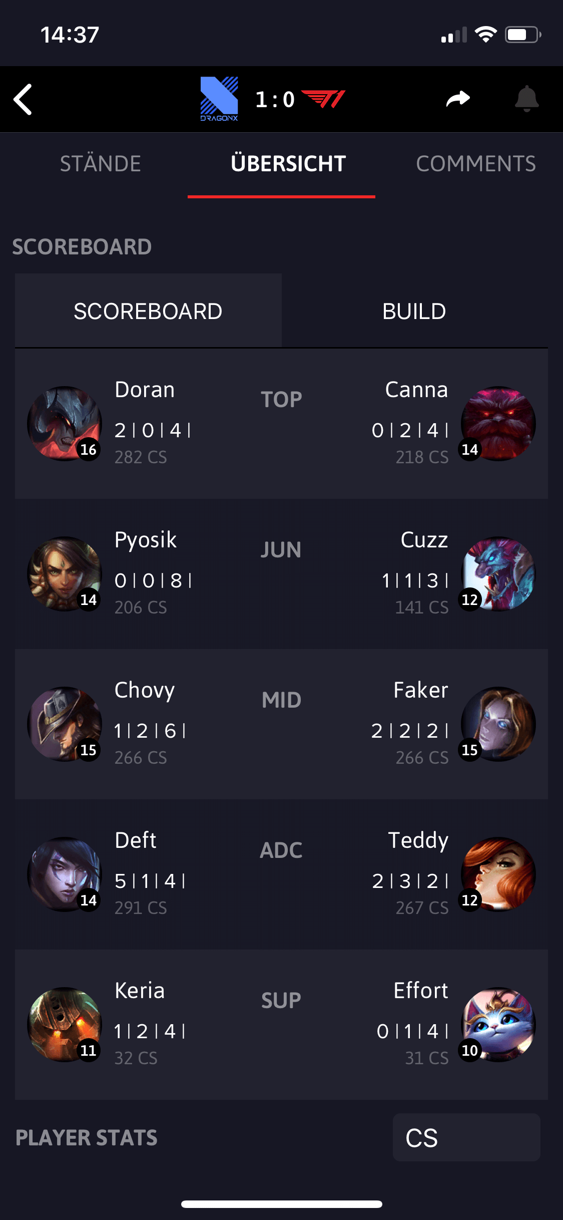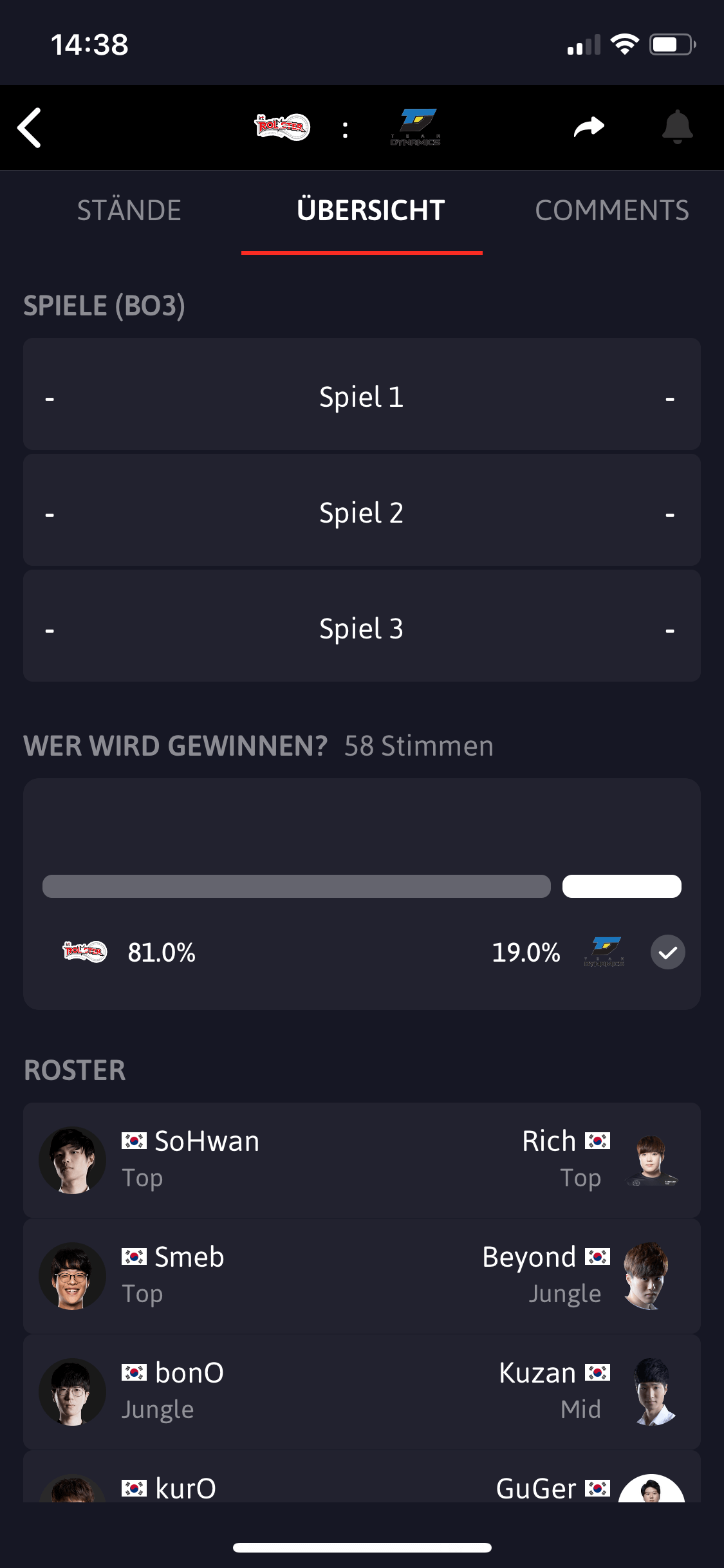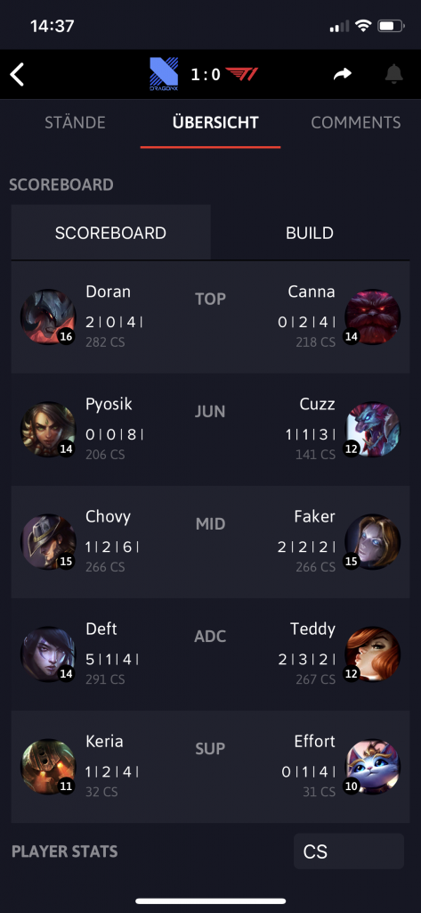 Zumeist findet ihr hier detaillierte Informationen zum Verlauf des Spiels und könnt zum Beispiel nachlesen, welcher Spieler wie viel Schaden gemacht hat und welchen Charakter er im Game genutzt hat. Auch Highlights-Videos lassen sich direkt in der App angucken. Natürlich kann auf dieser Page ebenfalls mit der Community kommentiert und diskutiert werden. Ein Feature, das wir an dieser Stelle besonders hervorheben wollen, ist die Voting-Funktion, bei der ihr im Vorhinein tippen könnt, welches Team eurer Meinung nach gewinnt. Wenn ihr richtig liegt, bekommt ihr dafür Punkte, die ihr auf eurem Profil einsehen könnt.