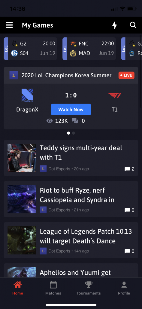 Ob E-Sport nun wirklich Sport ist oder nicht, da scheiden sich die Geister. Klar ist jedoch, dass die Fangemeinden immer riesiger werden. Und enstprechend werden immer mehr Turniere und kompetitive Spiele ausgetragen. Im Home Screen bietet euch die Upcomer App einen schnellen Überblick darüber, wer gerade live spielt und zeigt euch am oberen Rand, welche Spiele demnächst anstehen. Außerdem werdet ihr hier über die neuesten News aus der Branche informiert, die ihr direkt kommentieren und euch so mit anderen Fans austauschen könnt. Zusätzlich findet man unter der Trending-Kategorie tiefschürfende Videos und Interviews mit den Stars der Branche.