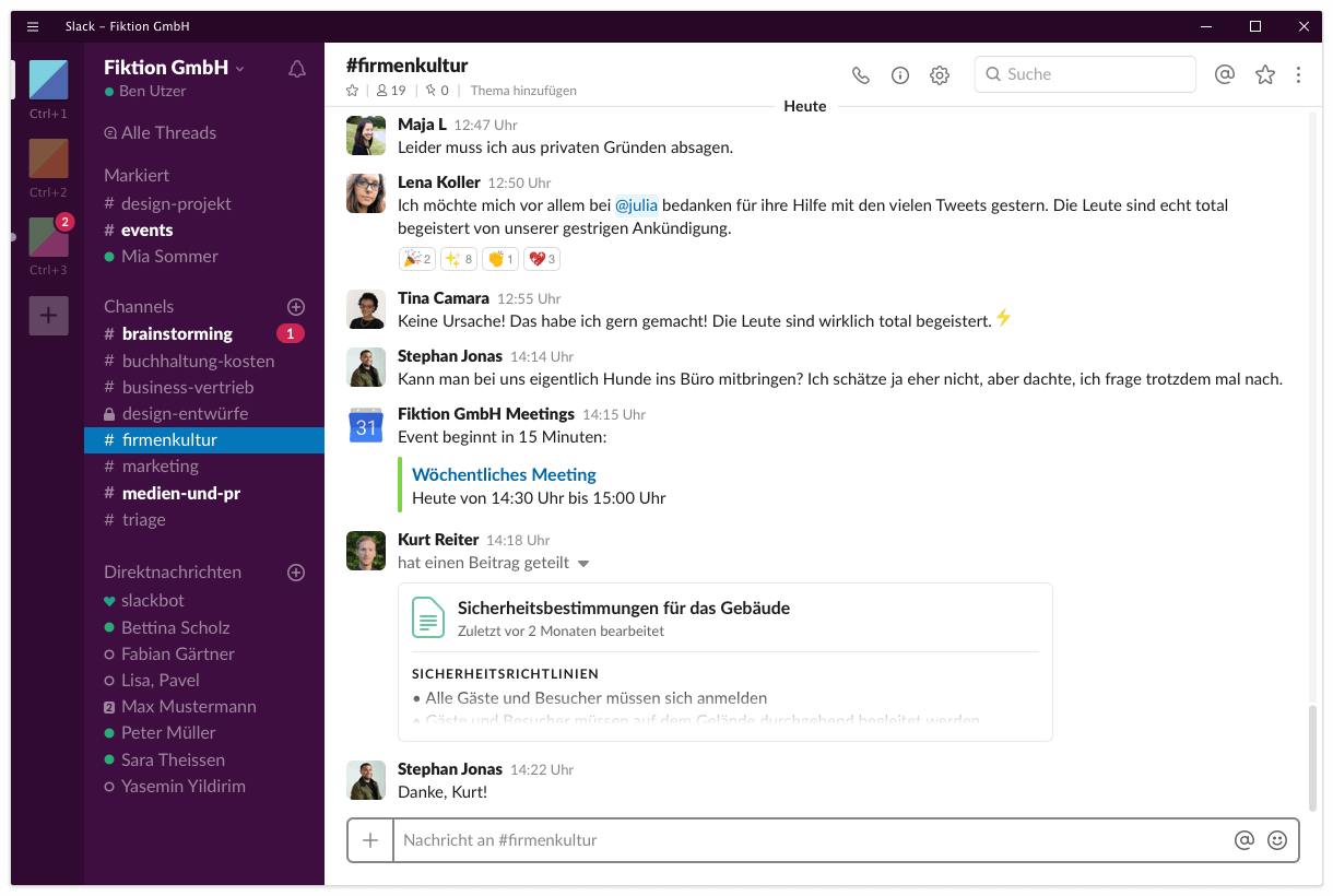 Slack ist ein Tool zum gemeinsamen Arbeiten, das Discord in seinem Funktionsumfang nicht ganz unähnlich ist. Aufgrund der Möglichkeit, mit Slack sowohl Gruppen- als auch Einzelgespräche durchzuführen, gehört es in unseren Videocall-Guide. Slack ist eigens für den Einsatz im Geschäftskontext entwickelt worden und erfordert die entsprechenden Datenschutzauflagen. Das macht es als generelles firmeninternes Kommunikationstool sehr interessant.