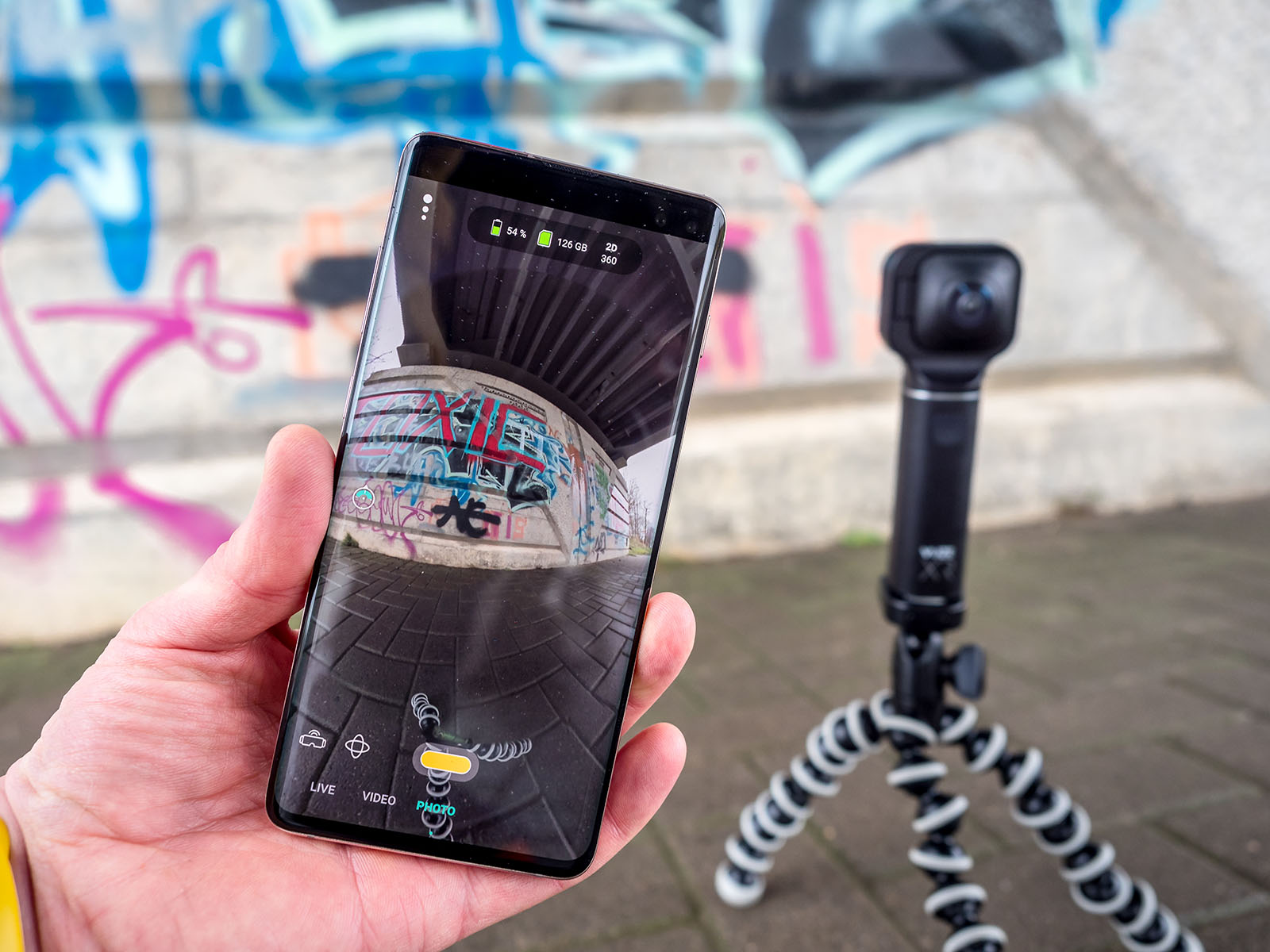 Ob Foto, Video oder Live-Streaming – den Betriebsmodus wiederum ändern wir nicht am Kameragehäuse, sondern in der App. Die Belichtung nimmt die Software vollautomatisch vor. Vor oder während der Aufnahme ändern können wir sie nicht.