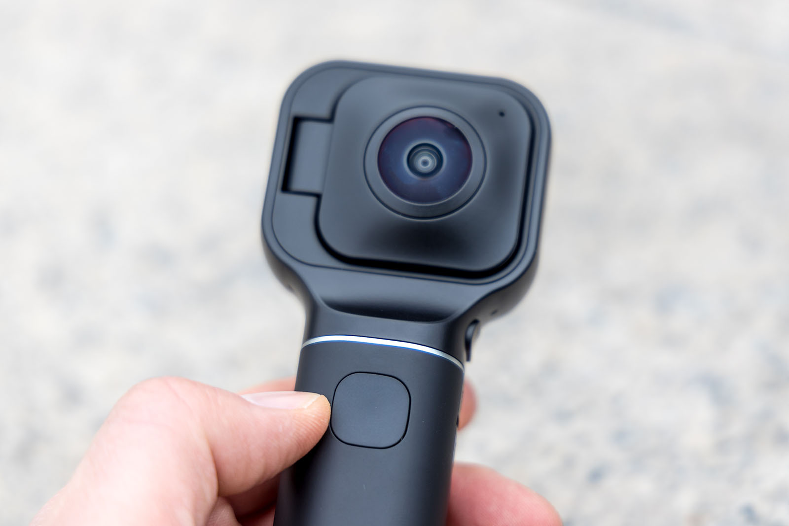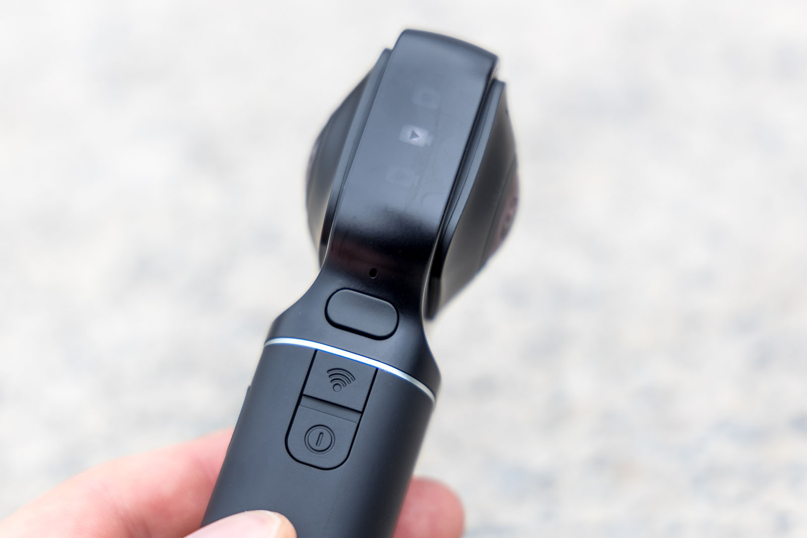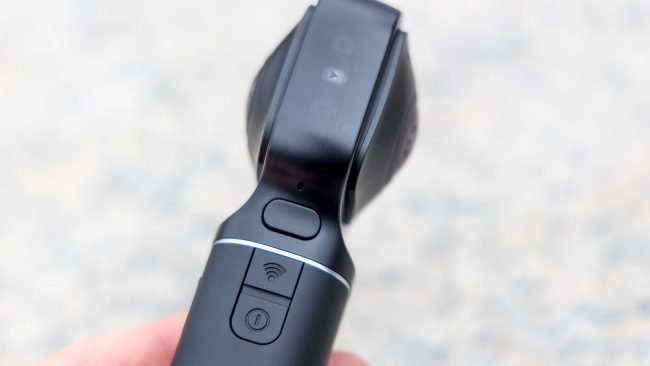 In puncto Design nähert sich Humaneyes dem Mainstream an. Nach der Vuze VR im sperrigen Look eines mobilen CD-Players, handelt es sich bei der Vuze XR um eine Stab-Kamera mit ausladendem Objektiv-Kopf, die gut in der Hand liegt. Das Bedienkonzept ist schlicht gehalten: Am Kameragehäuse befindet sich jeweils ein Knopf für An/Aus, WLAN-Verbindung, Klappmechanismus und fürs Auslösen. Das war‘s.