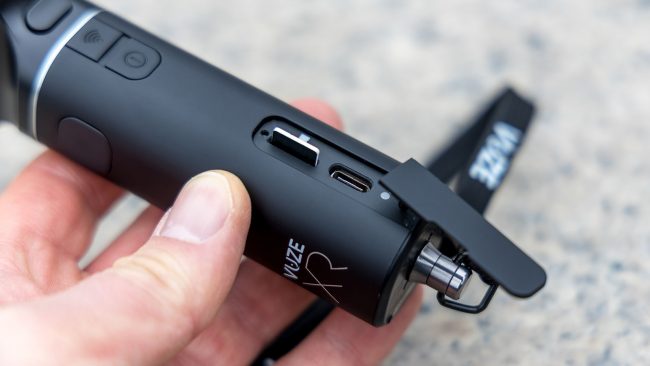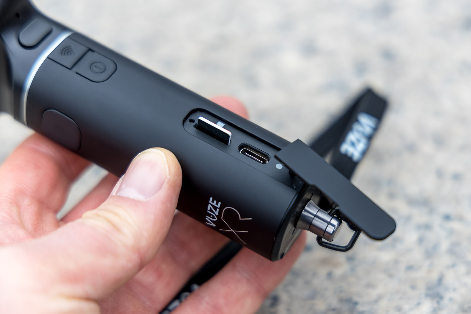 Die Vuze XR kommt ohne einen internen Speicher aus, daher ist eine Micro-SD-Karte zwingend notwendig. Sie akzeptiert schnelle Karten vom Typ UHS-II (U3). Nicht unüblich für diesen kompakten Formfaktor, fällt der Akku mit 1.200 mAh eher klein aus. Er hält laut Hersteller eine Einsatzstunde bis zum nächsten Aufladen durch, was unseren Erfahrungen nach hinkommt. Für ein längeres Shooting ist es also empfehlenswert, eine Powerbank dabei zu haben. Aufladen lässt sich der Akku mit zeitgemäßem USB-C-Kabel (USB 3.0).