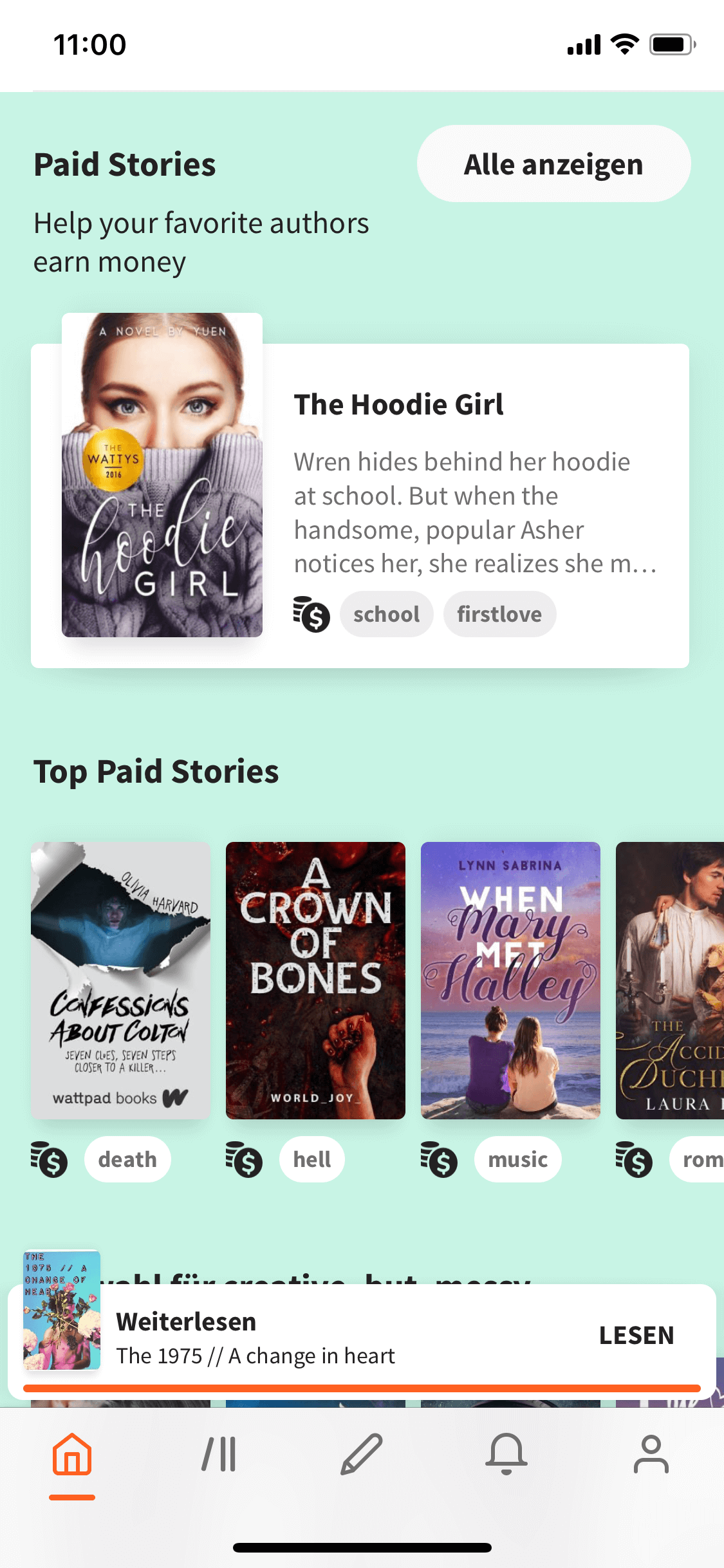 Egal ob in der Bahn, im Wartezimmer oder der Mittagspause: Wer die Geschichten auf Wattpad auch unterwegs lesen möchte, für den ist die App unverzichtbar. Denn sie bietet eine übersichtliche und trotzdem ansehnlich gestaltete Oberfläche, auf der ihr alle Aktionen ausführen könnt, die auch im Webbrowser möglich sind. Auf der Start-Page findet ihr eine Übersicht über alle Geschichten, die gerade angesagt sind und bekommt personell zugeschnitten Vorschläge, welche Stories euch interessieren könnten. Ein neues Feature sind außerdem die Paid Stories, also Bücher und Geschichten, die mittels Münzen bezahlt werden. Ein Buch kostet um die 130 Münzen, das sind umgerechnet circa sechs bis sieben Euro, je nachdem, welches Paket Münzen man sich kauft.