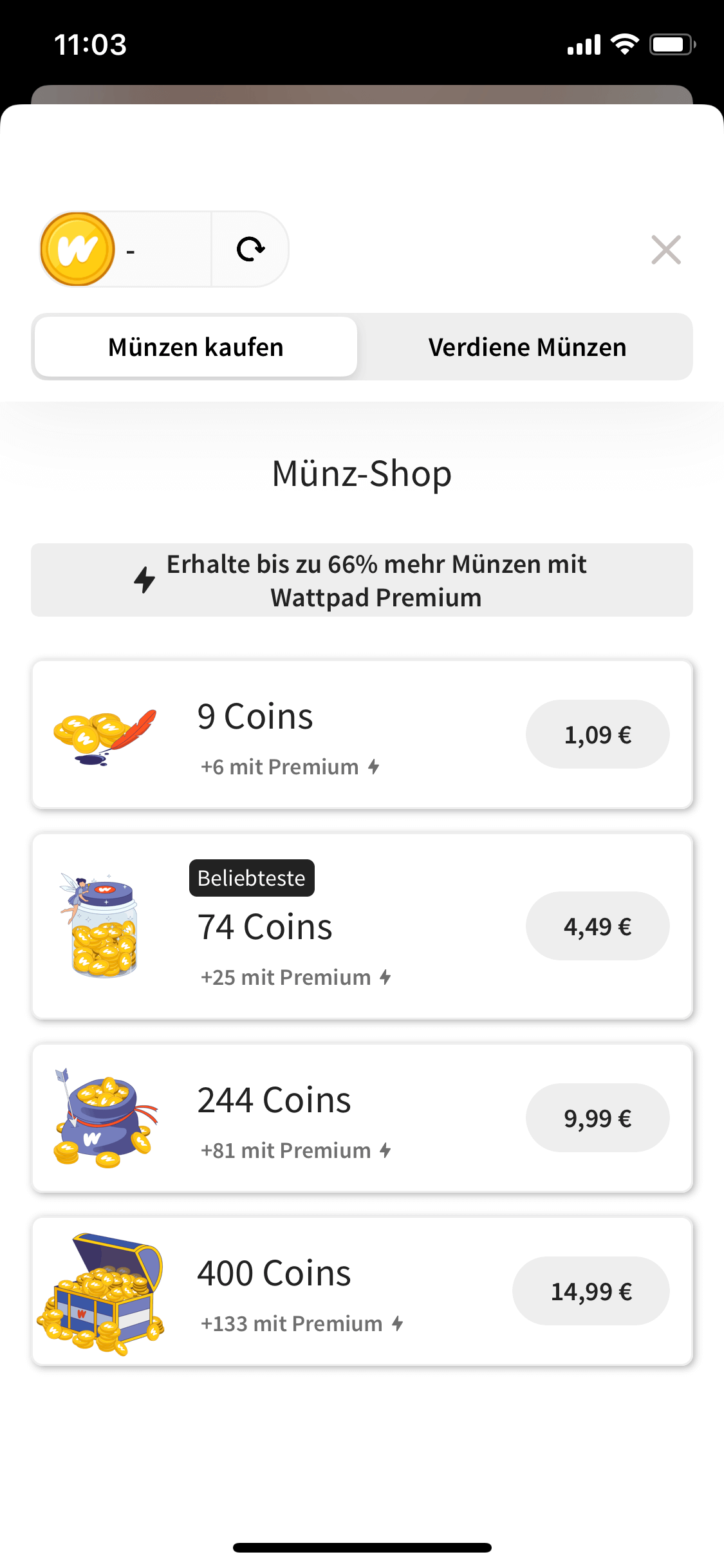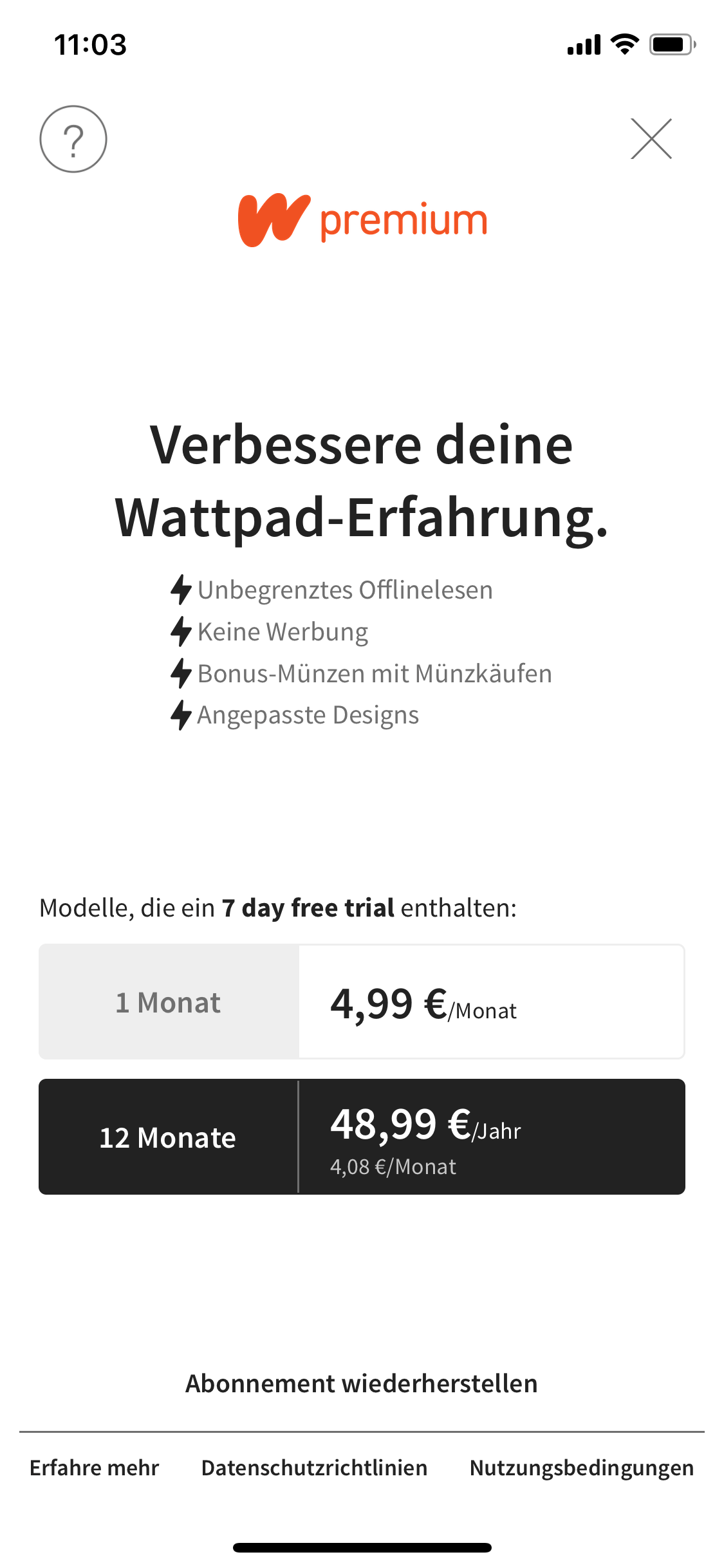 Ebenfalls eine Neuerung bei Wattpad ist das Premium Abo. Mit diesem ist die Werbung auf der Plattform passé, und ihr bekommt Zugriff auf weitere Designs für die App. Wer ein Premium Abo hat, bekommt außerdem noch einmal zusätzliche Münzen beim Kauf der Münz-Pakete. Das Abonnement kostet 4,99 Euro mit monatlicher Abbuchung und 48,99 Euro, wenn ihr gleich ein ganzes Jahr Premium bucht.