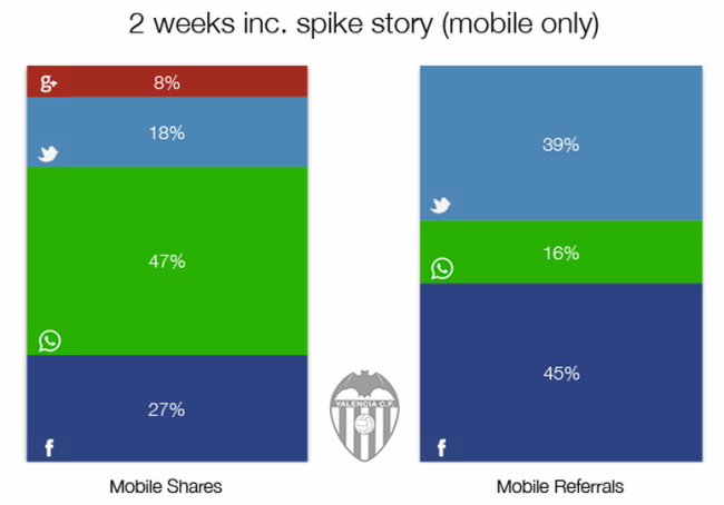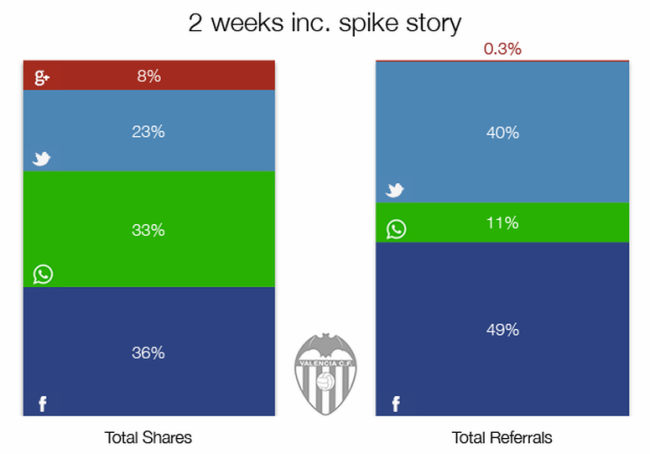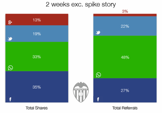Wie die meisten Fussballmannschaften besitzt auch der FC Valencia eine eigene Homepage, auf der Nachrichten über das Team veröffentlicht werden. Die Mobilversionen der Nachrichten enthalten vier Teilen-Buttons: Twitter, Facebook, Google+ und WhatsApp. Hier werden sowohl Klickzahlen erfasst (beispielsweise wie oft die jeweiligen Buttons angeklickt werden), als auch, was noch viel entscheidender ist, der Datenverkehr, indem man ein URL-Parameter einbaut, der bei der Datenerfassung hilft und anzeigt, von welcher Quelle der Leser auf die entsprechende Seite gelangt ist. So gerüstet, kann der FC Valencia herausfinden, auf welchen Plattformen am ehesten ein entsprechender Link geteilt wird. (Die Daten stammen von Daniel Ayers, Mitarbeiter von Seven League, einer sportaffinen digitalen Beratungsstelle, die auch für die aktuelle Leitung des Bereichs für digitale Marktleitung des FC Valencia tätig ist).