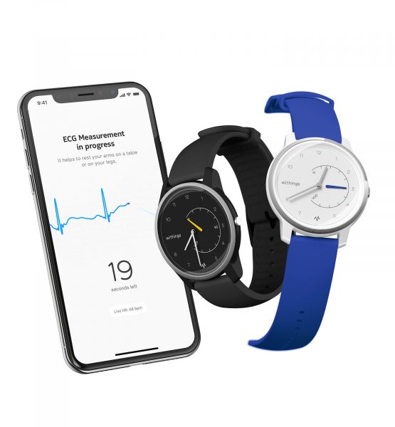 Die Variante Withings Move ECG bietet bei etwas kürzerer Batterielaufzeit (zwölf Monate) die gleichen Möglichkeiten, verfügt aber noch über eine weitere Funktion. Mittels dreier Elektroden im Uhrengehäuse zeichnet sie auf Wunsch ein Elektrokardiogramm auf und hilft auf diese Weise Nutzern, das sogenannte Vorhofflimmern zu erkennen. Dabei handelt es sich um eine besonders schwere Form eines unregelmäßigen Herzrhythmus, der im günstigeren Fällen zu Müdigkeit und Kurzatmigkeit, schlimmstenfalls aber zu Schlaganfällen und Herzinfarkten führt. Die in der App Health Mate gespeicherten EKG-Daten haben laut Withings die Qualität, Medizinern bei Diagnose und Behandlung zu unterstützen. Die Apple Watch 4 verfügt über eine ähnliche Funktion, die aber noch nicht freigeschaltet ist.