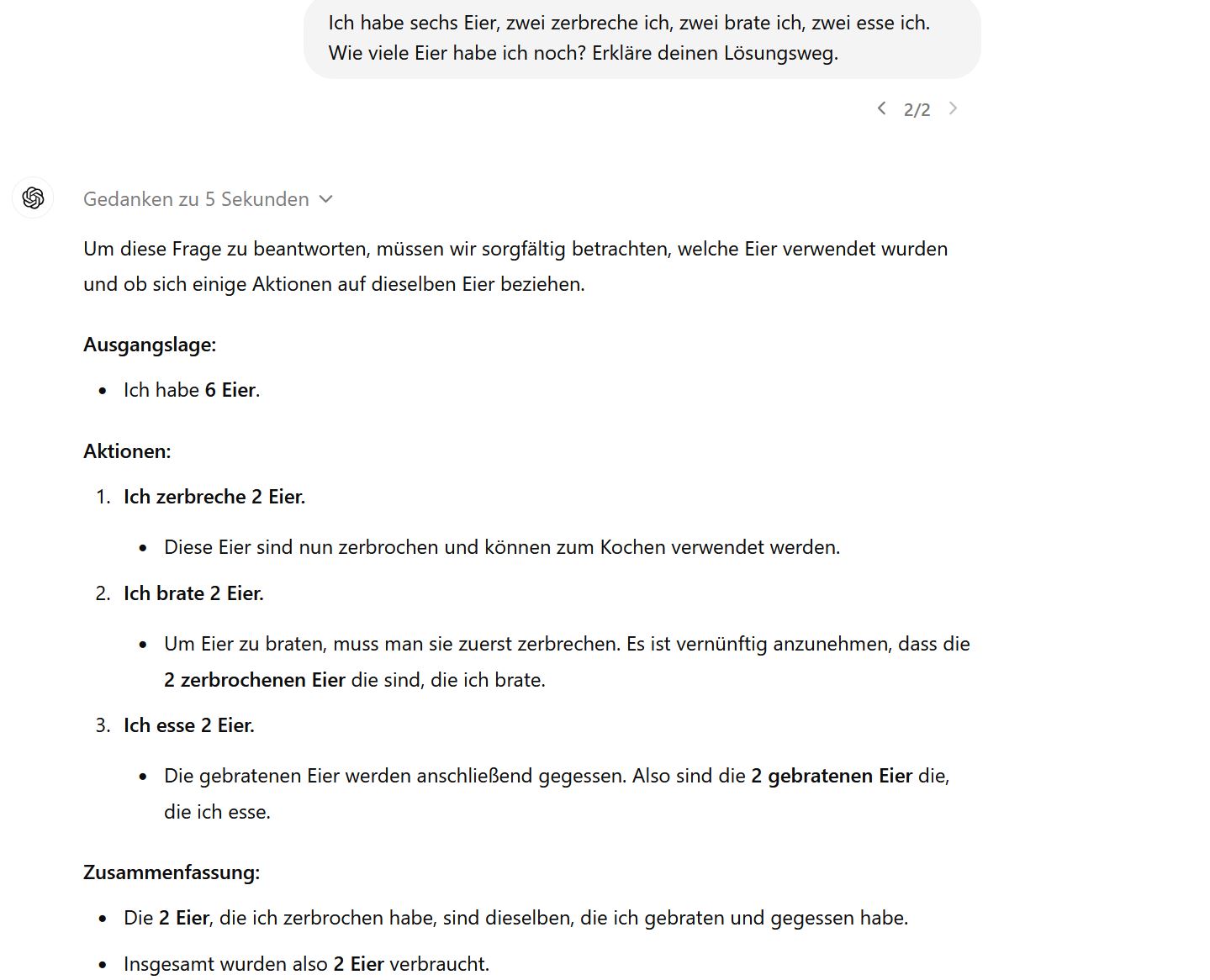OpenAI o1 lohnt sich für solche Aufgaben, weil sie einen menschlicheren Denkprozess verfolgt. Das Modell nimmt sich vor der Antwort mehr Zeit, sich mit der Problemstellung zu befassen. Durch Training lernt das Modell seinen Denkprozess zu verbessern, probiert verschiedene Strategien aus und lernt aus Fehlern. Dabei nutzt es eine „Kette von Gedanken“, um ein Problem Schritt für Schritt zu lösen. Es eignet sich daher besonders gut für Aufgaben der Wissenschaft, Mathematik oder des Programmierens.
