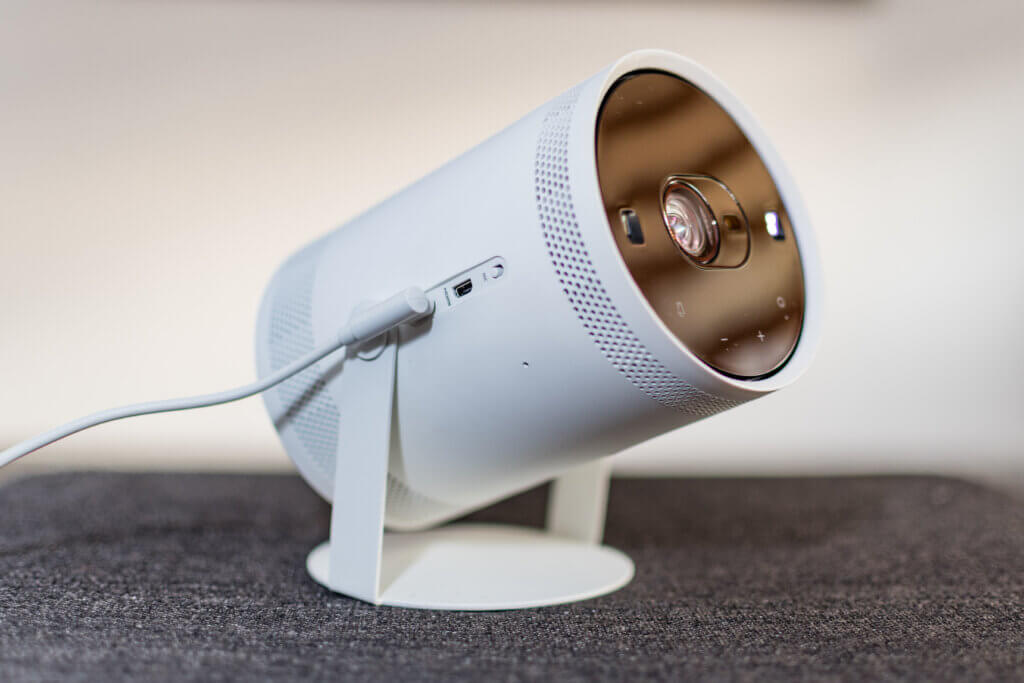 Der Samsung The Freestyle ist mit Maßen von 10,2 x 17,3 x 9,5 Zentimetern und einem Gewicht von 800 Gramm etwas kleiner und um die Hälfte leichter als das Mitbewerberprodukt. Der Kopf mit der LED-Linse ist schwenkbar und damit das Bild frei im Raum – und sogar an die Decke – konfigurierbar. Allerdings nur um eine Achse, eine Rotation des Bildes in sich ist nicht möglich. Zudem gab es im Test Probleme bei der Fixierung des Kopfes. Aufgrund des Schwerpunkts senkt sich die Linse bei Erwärmung des Geräts. Wie auch beim Xgimi Halo+ beträgt die maximale Bildschirmdiagonale 100 Zoll. Dieser Wert ist der Auflösung geschuldet, die FullHD (1920 x 1080 Pixel) beträgt. Der einzige Lautsprecher sitzt auf der Unterseite und strahlt entgegen der Projektorrichtung.