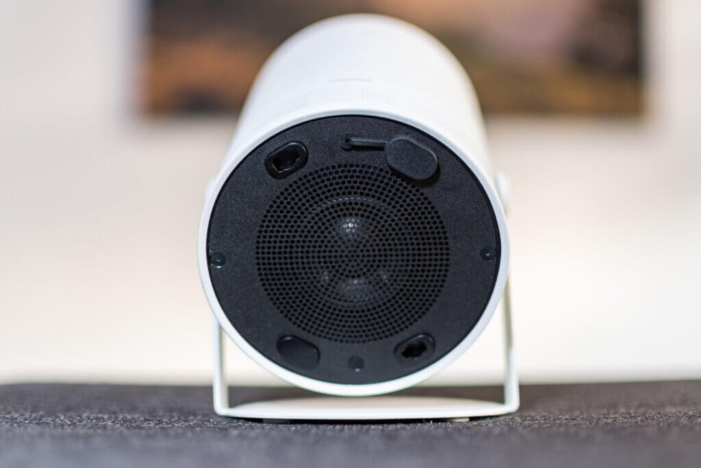 Das schicke und funktionale Design des Samsung The Freestyle findet beim Lautsprecher seine Grenzen. Er strahlt entgegen der Leuchtrichtung nach hinten. Verrichtet das Lifestyle-Gadget nun mit stumpfem Winkel seinen Dienst, verschluckt sich der Ton an sich selbst. Zwar sind Stimmen gut zu verstehen, allerdings wirkt der Klang sehr punktuell und ein Stereo-Erlebnis bleibt aus. Dieser Effekt verstärkt sich, wenn der Projektor nicht direkt vor den Zuschauenden steht. Nichts zu meckern gibt es in Sachen Lüfterlautstärke: Mit 30 Dezibel unter Volllast sind beide Geräte angenehm leise.