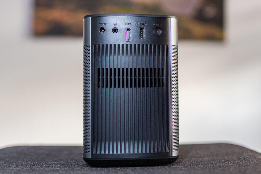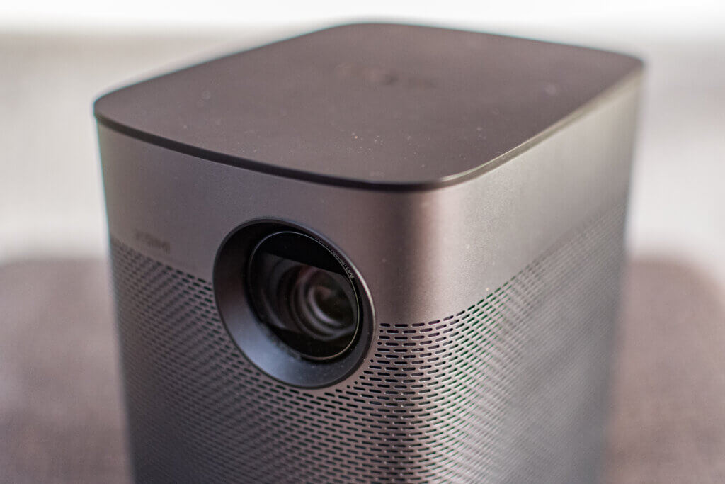 Vorbei ist die Zeit, als die Multimedia-Beamer nur groß und klobig waren. Die Hersteller bewerben ihre Produkte als mobile Geräte mit smarten Funktionen. Sowohl Xgimi Halo+ als auch Samsung The Freestyle überzeugen durch einen gefälligen Formfaktor: Ersterer kommt mit Maßen von 11,3 x 14,5 x 17,1 Zentimeter daher und bringt 1,6 Kilogramm auf die Waage. Die lichtstarke LED-Linse befindet sich in der rechten oberen Ecke. Damit schafft das Gerät einen angenehmen Abstand zur Unterlage. Ein schmaler Klappfuß lässt den Winkel nur geringfügig vergrößern. Rechts und links im Gehäuse befinden sich die Harman/Kardon Lautsprecher. Aber dazu später mehr.