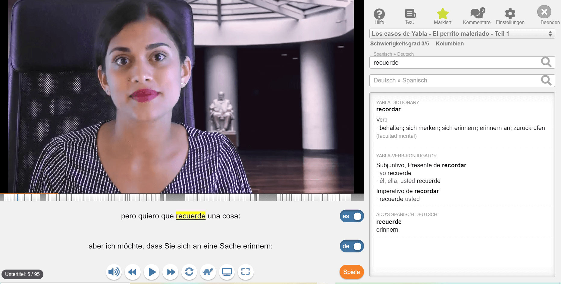 Wenn ihr eine Sprache mit der App neu lernt, ist es von Vorteil, die interaktiven zweisprachigen Untertitel zu aktivieren. Dadurch seht und hört ihr nicht nur das Video, sondern könnt das Gesprochene sowohl in der Fremdsprache, als auch in der eigenen Sprache mitverfolgen. Da die Videos von Muttersprachlern der jeweiligen Sprache aufgenommen wurden, bekommt ihr authentische Inhalte und lernt beinahe akzentfrei zu sprechen. Ihr könnt das Video auch verlangsamen oder einzelne Sätze wiederholen lassen. Wenn ihr die genaue Übersetzung eines Wortes sehen wollt, könnt ihr in den Untertiteln ganz einfach auf ein Wort klicken. Die Übersetzung wird euch dann sofort am rechten Bildschirmrand angezeigt. Bei Verben seht ihr hier zusätzlich die Konjugation. Mit diesen Funktionen hilft Yabla euch, den Inhalt der Videos tatsächlich zu verstehen.