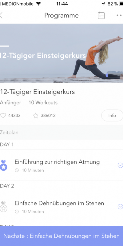 Es wirkt ein wenig so, als würden die Entwickler gerade erst die deutschsprachige Version einführen. Einige Inhalte findet ihr auf Deutsch, andere nur auf Englisch. Mich persönlich stört es nicht zwingend. Es sei aber trotzdem gesagt, denn nicht jeder möchte Yoga-Apps auf einer anderen Sprache nutzen.