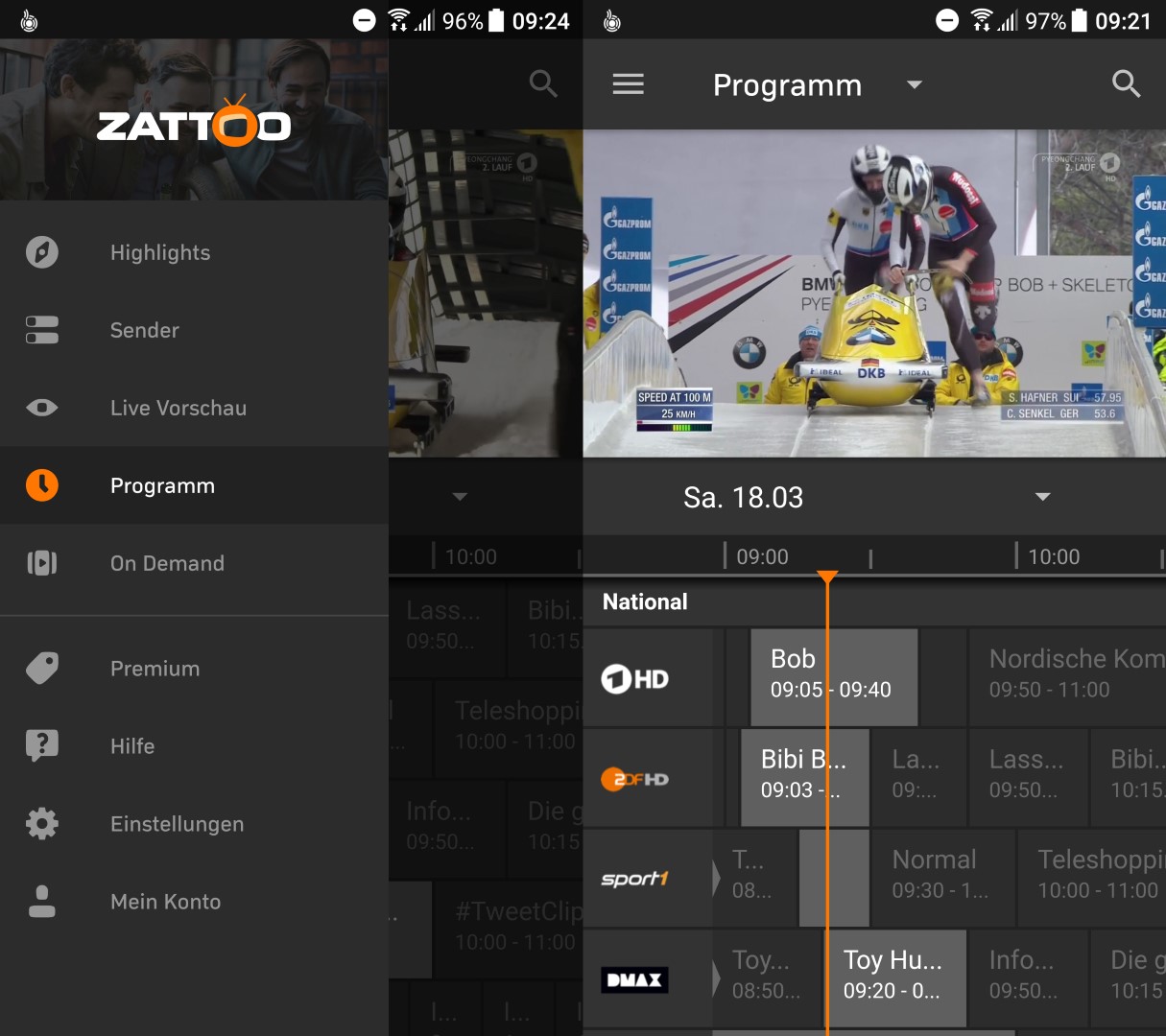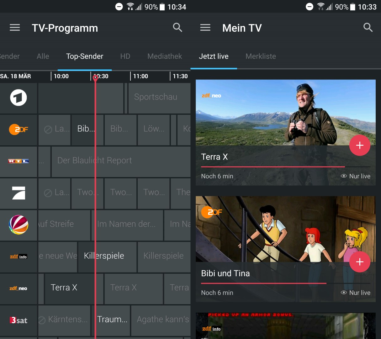 Wie bei den anderen Angeboten können mit einem kostenlosen Konto die öffentlich rechtlichen Programme in SD-Qualität geschaut werden. Zusätzlich sind Privatsender wie Eurosport, Deluxe Music oder die Nachrichtensender Deutsche Welle, CNN und Euronews verfügbar. Weitere Privatsender sind im Comfort-Paket verfügbar, das mit monatlich 4,99 Euro zu Buche schlägt und auch dementsprechend kündbar ist. Die 59 Sender flimmern in Standard-Qualität über das Mobilgerät, eine HD-Option kostet einen Euro zusätzlich. Im Comfort-Paket sind neben dem Pausieren von Sendungen auch 10 Stunden Aufnahmespeicher enthalten. Wie in alten VHS-Zeiten kann das TV-Programm also auch definiert aufgezeichnet werden. Wem das nicht reicht, der kann auf das Perfect-Paket zugreifen. Der Aufnahmespeicher erhöht sich auf 50 Stunden und zudem ist eine Mobiloption fürs TV-Streaming im Mobilfunknetz enthalten. Der Preis steigt dann allerdings auf 14,99 Euro pro Monat.