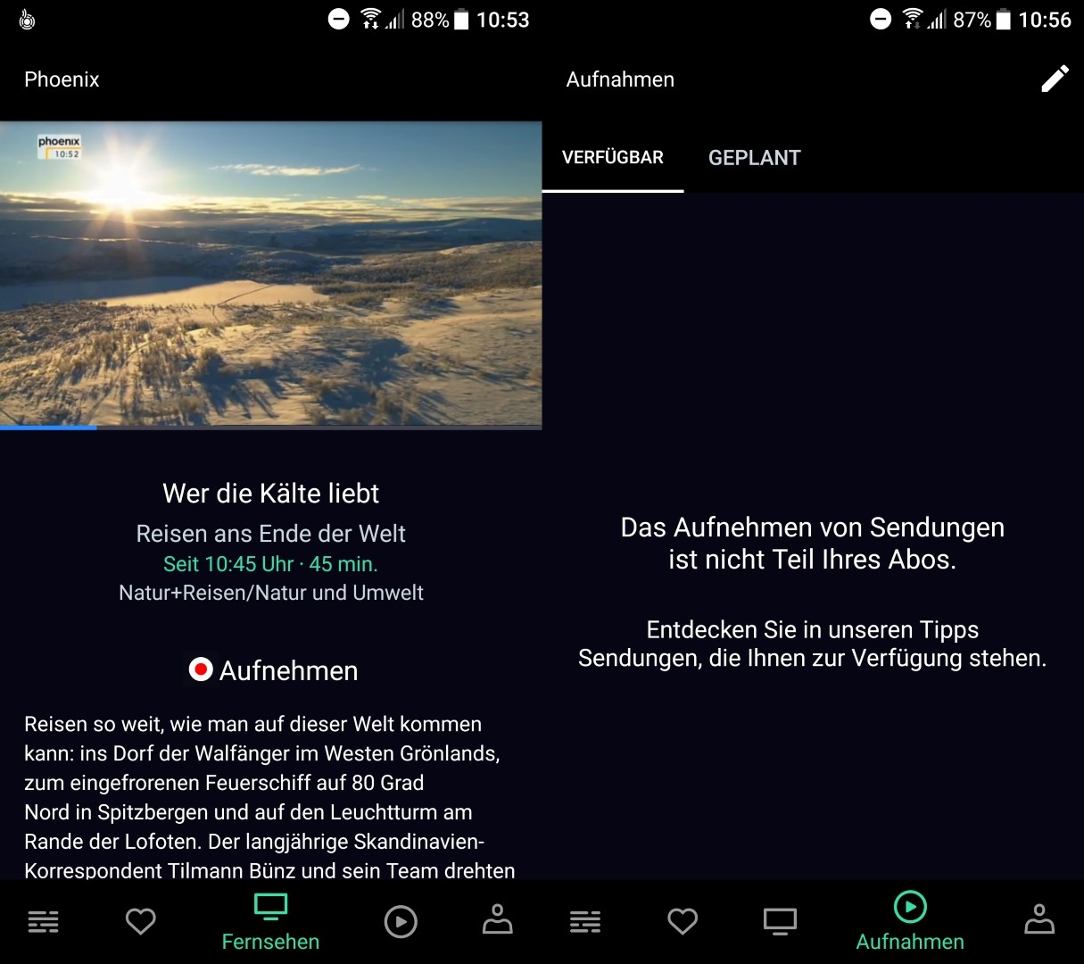 Anders als Magine und Zattoo funktioniert Waipu ausschließlich auf Mobilgeräten. Dementsprechend bietet die im Play Store verfügbare App ein ansprechendes Design und eine sehr gute Performance. Innerhalb von wenigen Sekunden ist der Stream geladen und durch einfaches Wischen nach rechts oder links schnell gewechselt. Über einen Reiter im unteren Bereich stehen zudem ein EPG, TV-Tipps, der Aufnahmespeicher sowie das Nutzerkonto zur Verfügung. Wie bei Zattoo und Magine ermöglicht Google Chromecast die Wiedergabe auf einem TV-Gerät. Seit letzter Woche wird zudem Amazons Fire TV unterstützt.